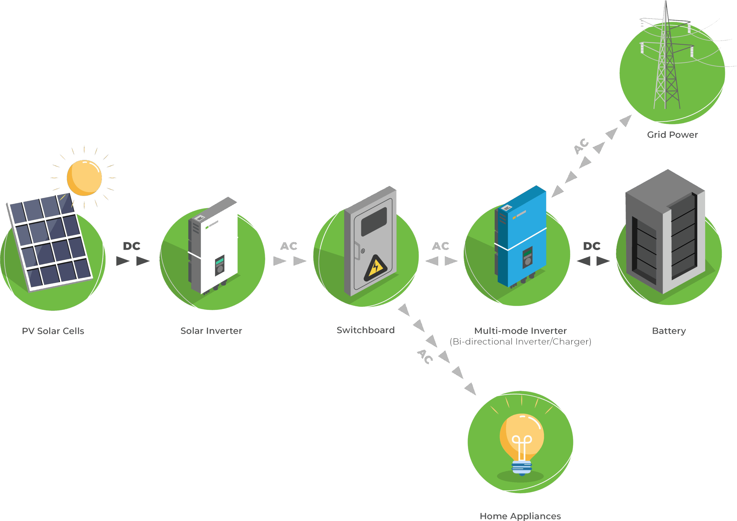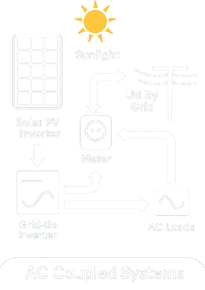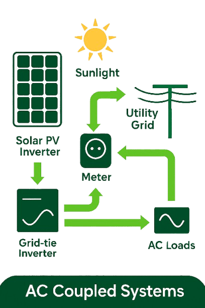 Solar panels convert sunlight into electricity (DC). This electricity is then converted into usable power (AC) by an inverter and used in your home or business. Excess energy can be stored in batteries or sent back to the grid.