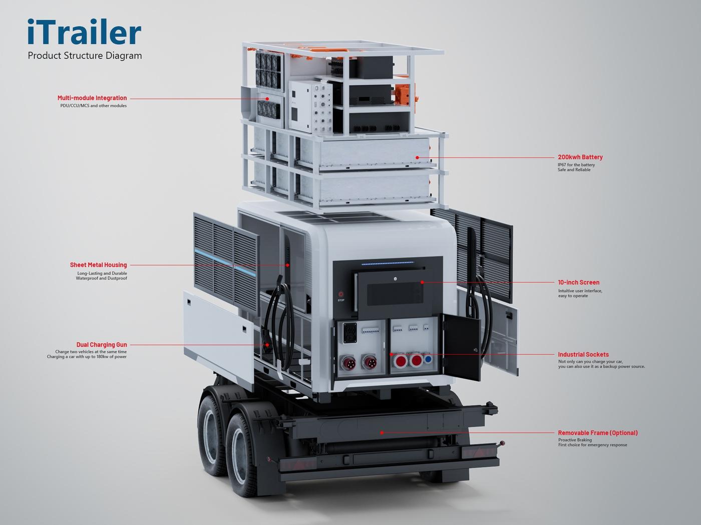 iTrailer (120kW/103kWh) offers CCS2 fast charging, dual 6kW guns, multi-AC outlets, and compact, mobile energy storage.